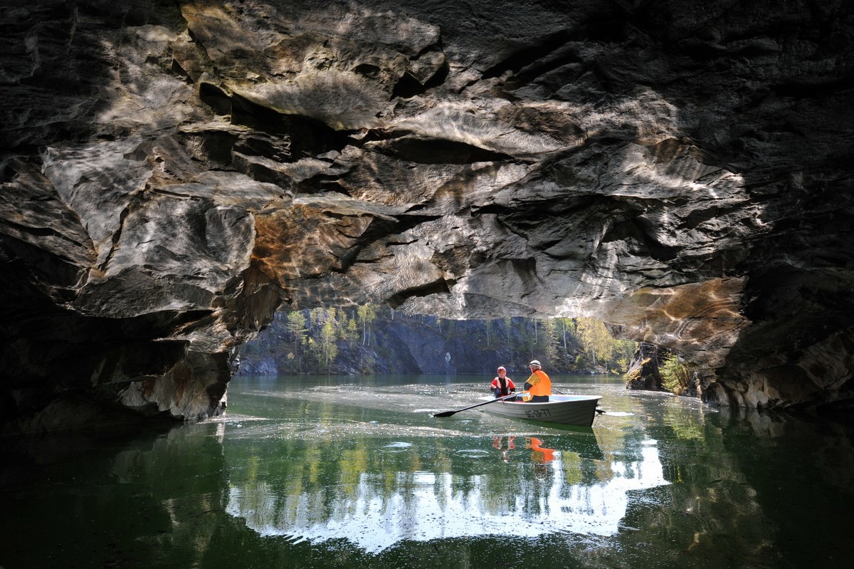 Мраморный Каньон Далее перед вами предстанет уникальное творение — огромная чаша, вырубленная руками человека в массиве мраморного пласта, которая простирается с севера на юг на 456 метров, а ее ширина — 109 метров. Вы прогуляетесь вдоль необыкновенного озера с кристально чистой водой изумрудного оттенка. Эко-тропа вокруг Рускеалы протяженностью 1,5 километра имеет множество панорамных площадок, с которых открываются виды на это уникальное место. Вы сможете немного отойти от основной тропы и пройти в глубину сквозной пещеры (штольни) и увидеть геологию каньона или покататься на лодке по пещерам каньона.