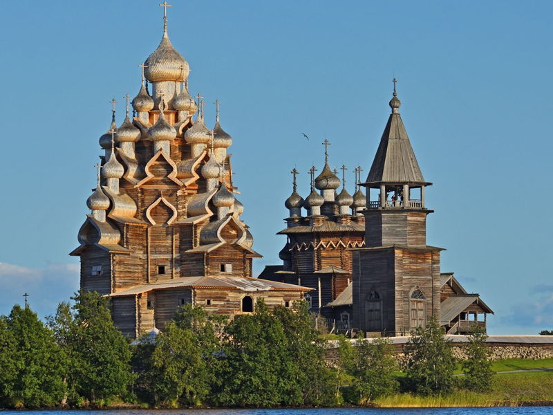 - Кижский погост, который включает церковь Преображения Господня, построенную «без единого гвоздя»