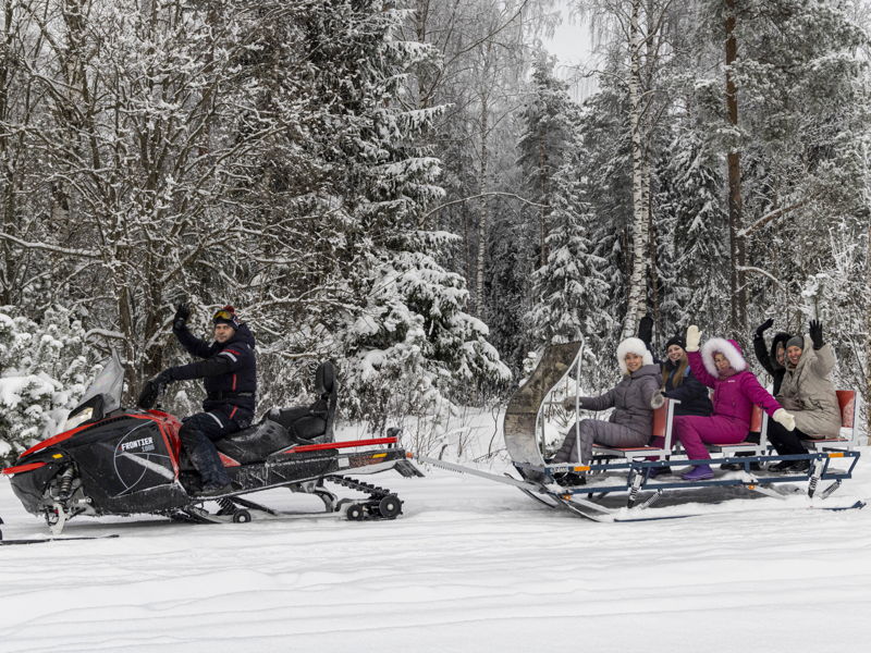 Когда душа просит драйва и ярких эмоций, идеальный вариант активного отдыха – катание на санях за снегоходом. Вас ждет живописный маршрут, проходящий через сосновые и еловые перелески, и опытный инструктор поможет насладиться всеми красотами зимних пейзажей.