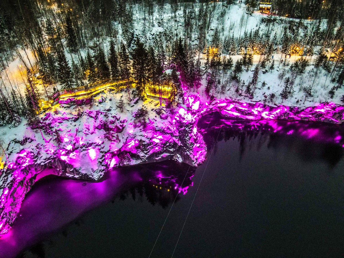 С 16:00 до 19:20 посетим горный парк «Рускеала». Зимой особенно впечатляет вечерняя подсветка каньона и троп. В новогодний период в парке проходят праздничные гуляния и ярмарка с выступлениями артистов и народными забавами.