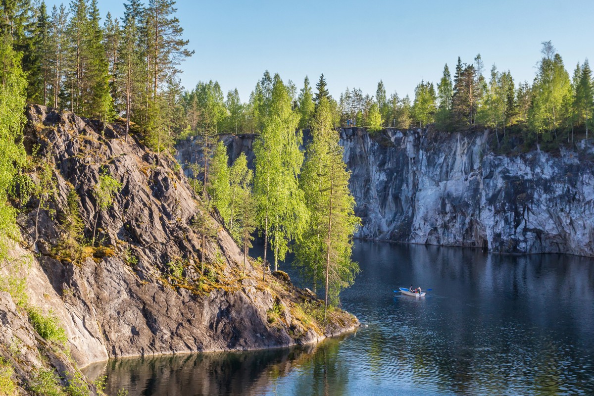 Следующая остановка — горный парк «Рускеала» — пожалуй, самая знаменитая достопримечательность края озёр. Здесь вы сможете самостоятельно погулять (у вас будет около 3 часов) и исследовать Мраморный каньон с живописными скалистыми берегами, Итальянский карьер, спуститься в пещеры и штольни, посетить сувенирные магазинчики и мастерские.